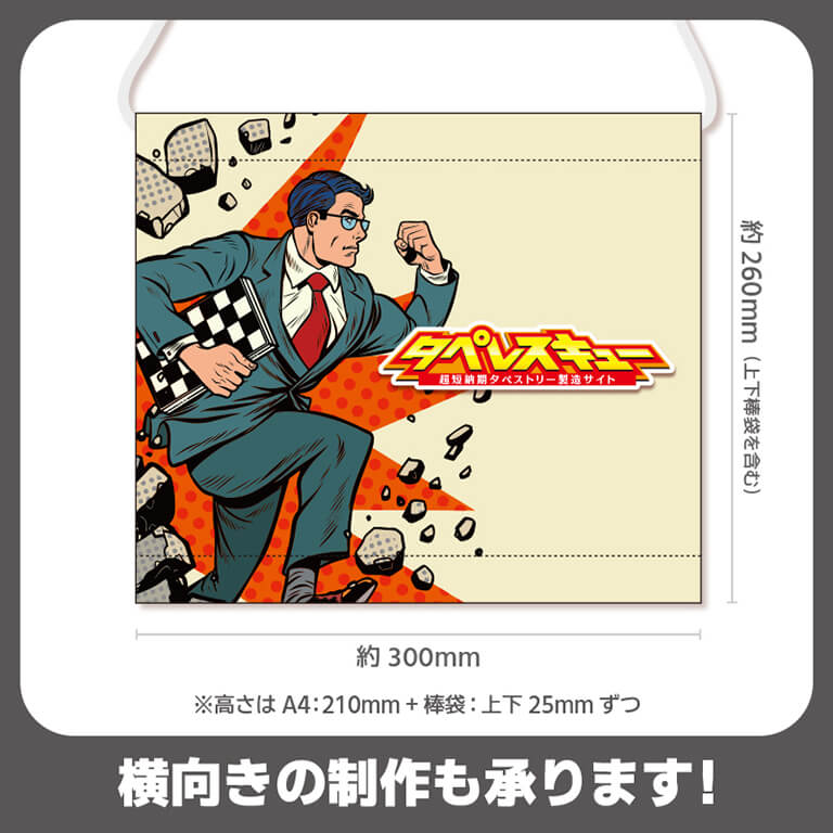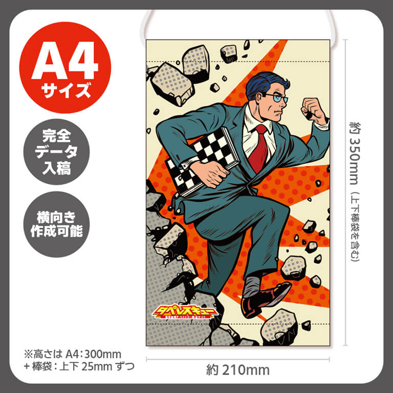 オリジナルタペストリーのご注文は、完全データ入稿となりますので、デザインデータはお客様の方で作成をお願いいたします。デザイン作成用のテンプレートファイルをご用意しておりますので、ダウンロードしてお使いください。データ作成については データ作成ガイド をご確認ください。