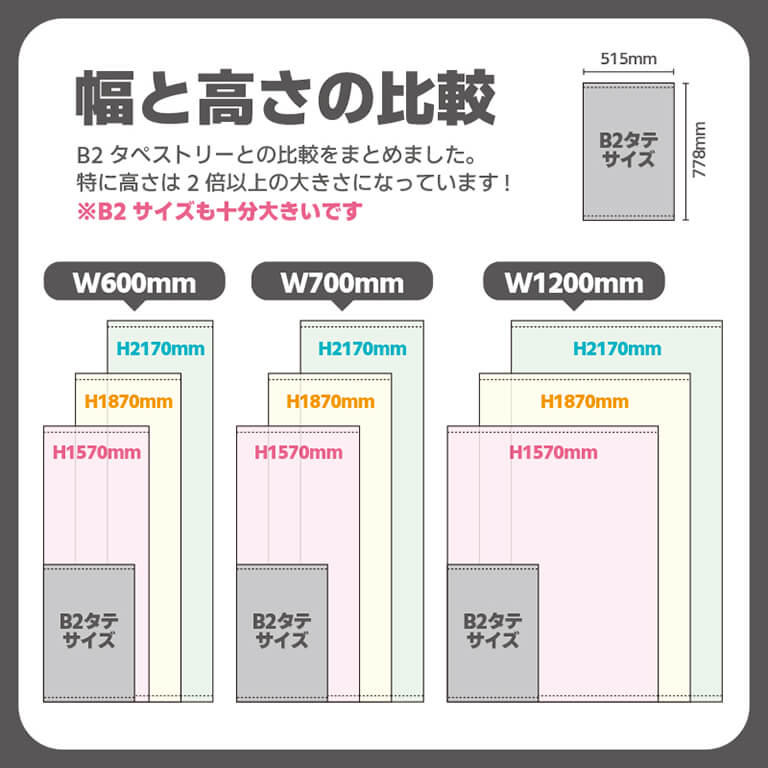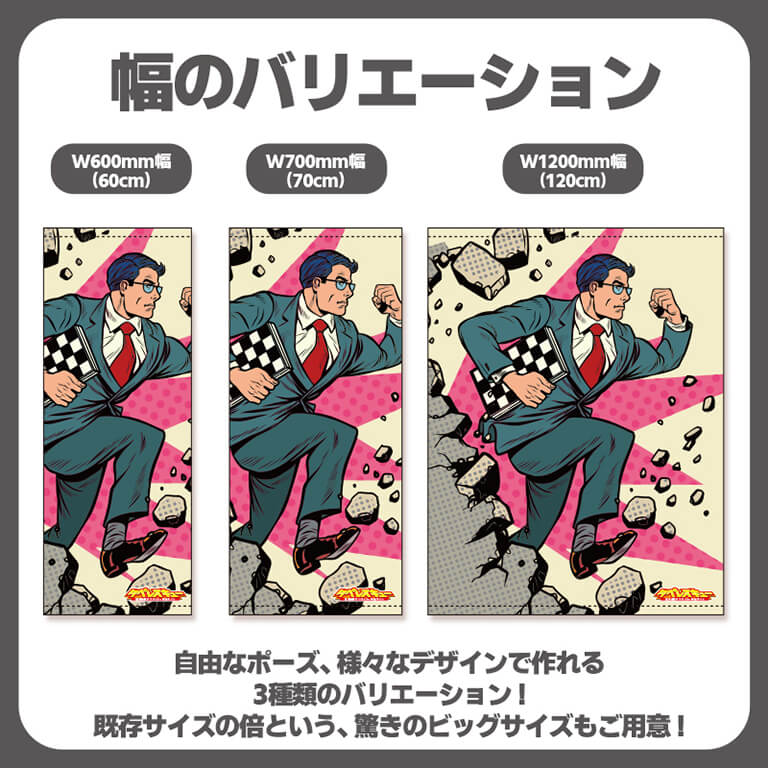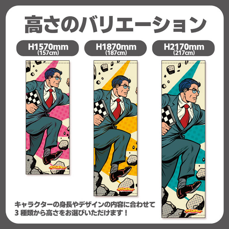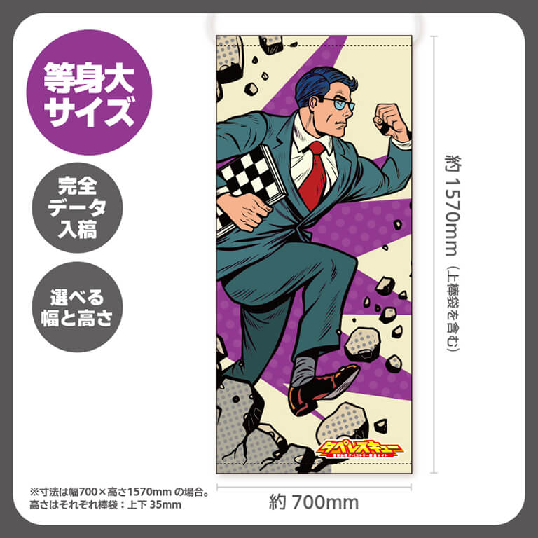 オリジナルタペストリーのご注文は、完全データ入稿となりますので、デザインデータはお客様の方で作成をお願いいたします。デザイン作成用のテンプレートファイルをご用意しておりますので、ダウンロードしてお使いください。データ作成については データ作成ガイド をご確認ください。- タペストリーの向きは「縦向き」で固定となります。予めご了承ください。